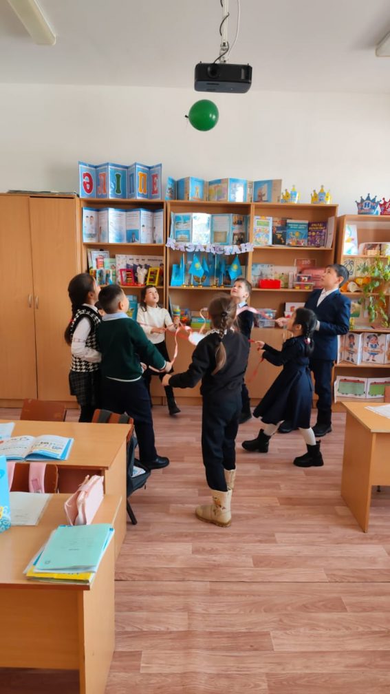 Бастауыш сынып оқушылары үзіліс кезінде эмоцияларын көтеру мақсатымен көңілді ойындар ойнайды.