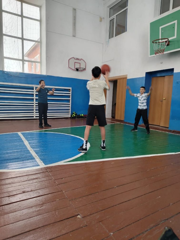 7-8 сынып оқушылар дене шынықтыру сабағында баскетбол ойындар.