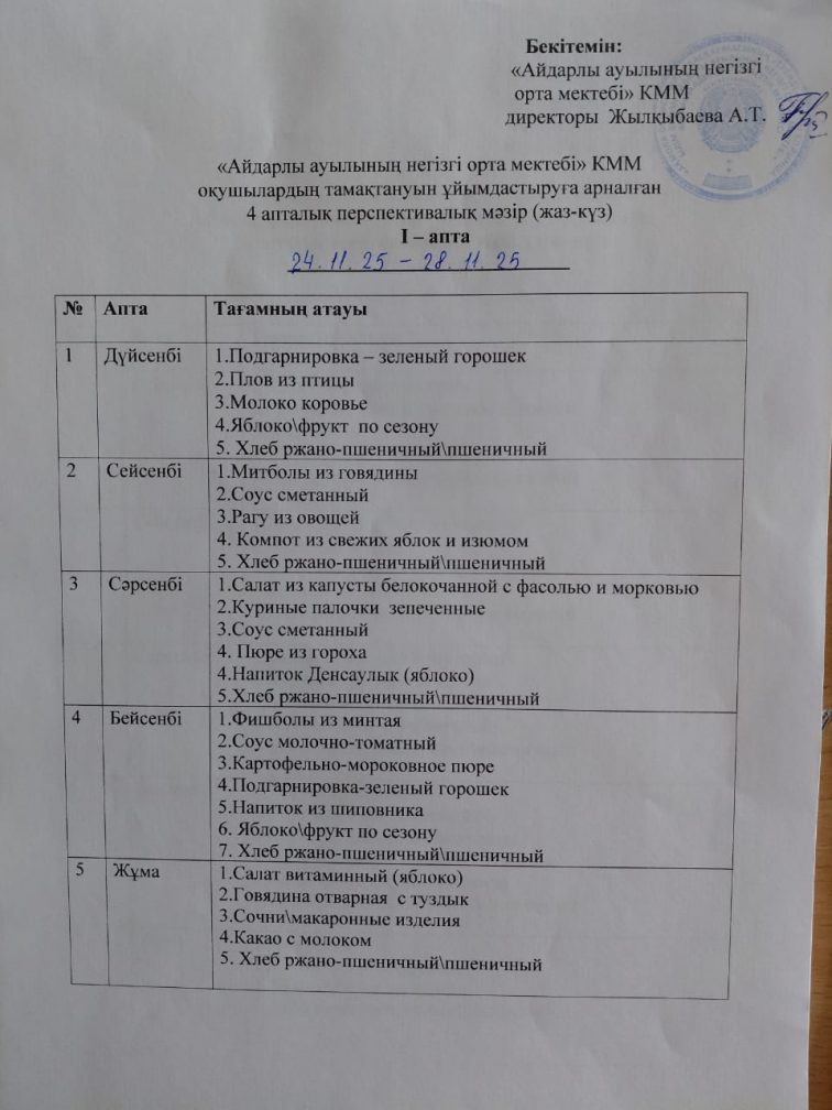 Ас мәзірі. Жаз-күз. І апта