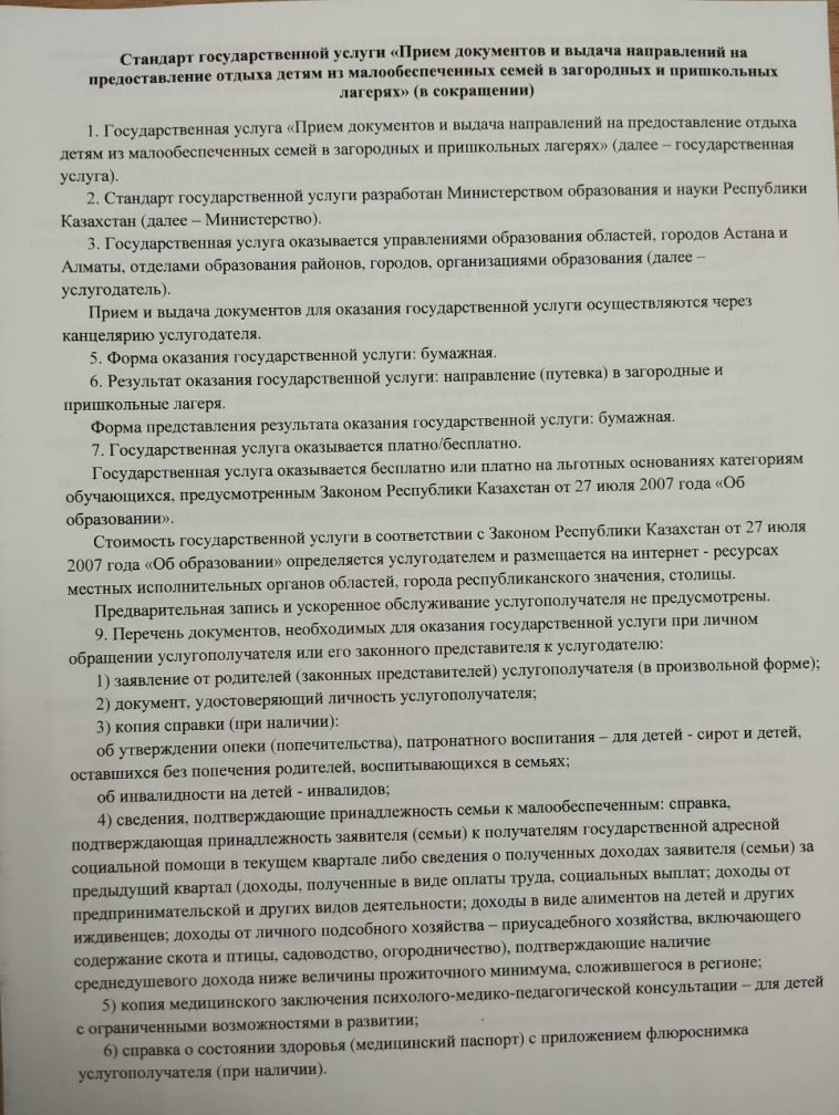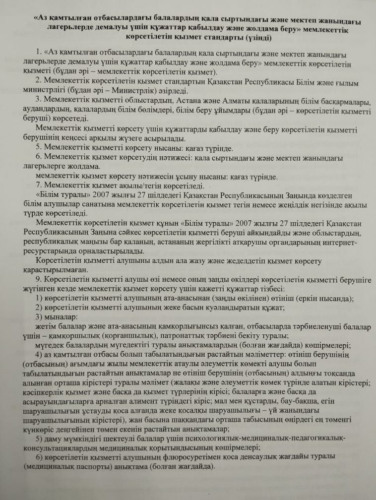 Оказание государственной услуги "Прием документов для летнего отдыха детей из малообеспеченных семей за городом и пришкольных лагерях".